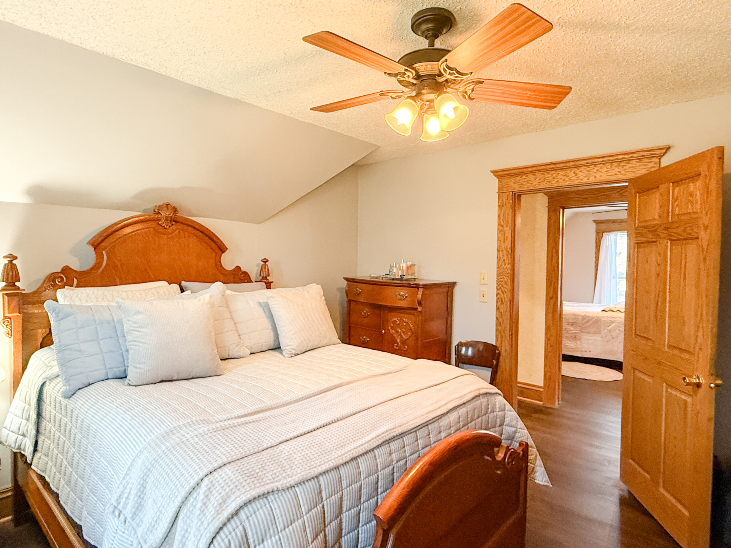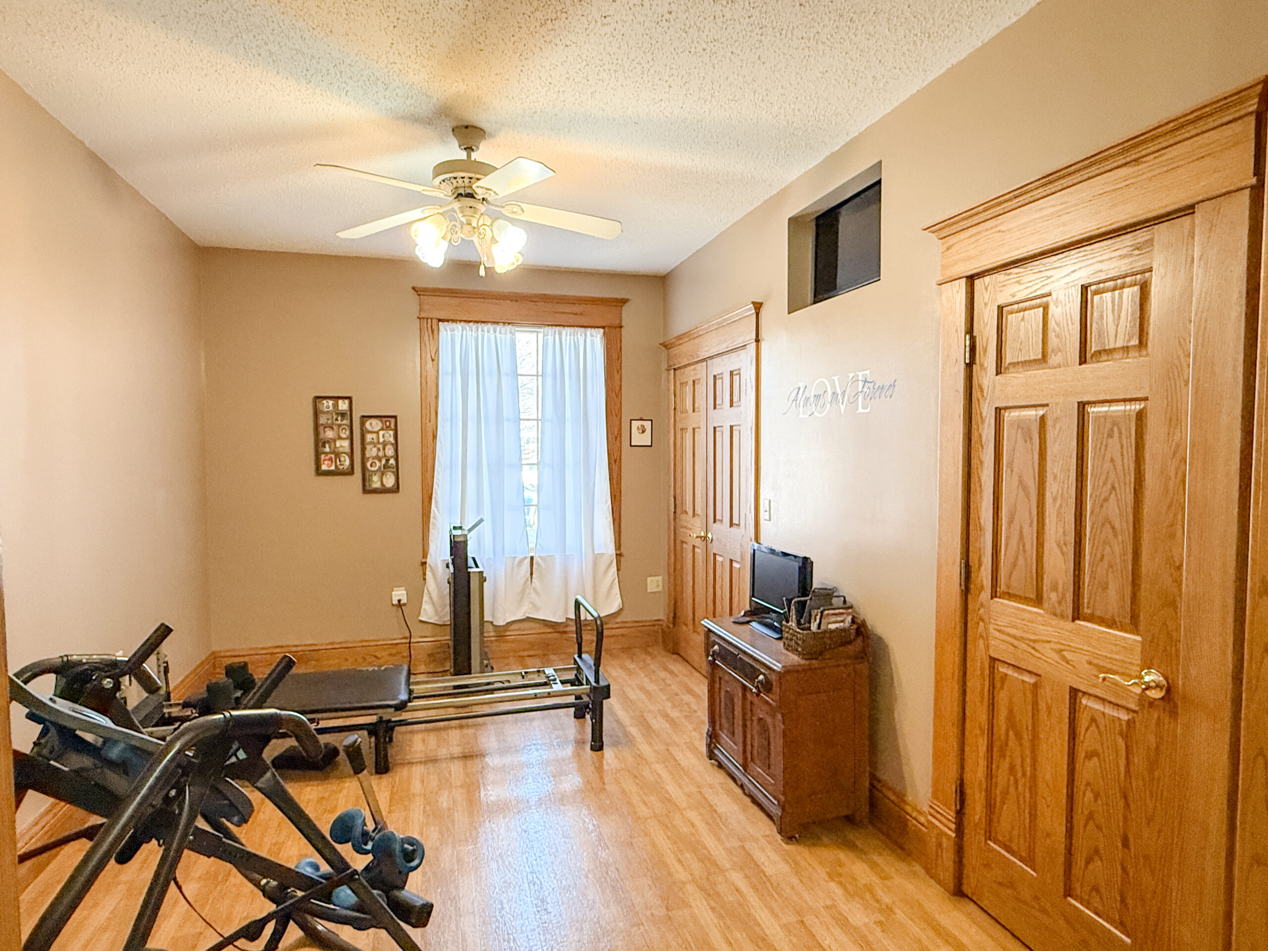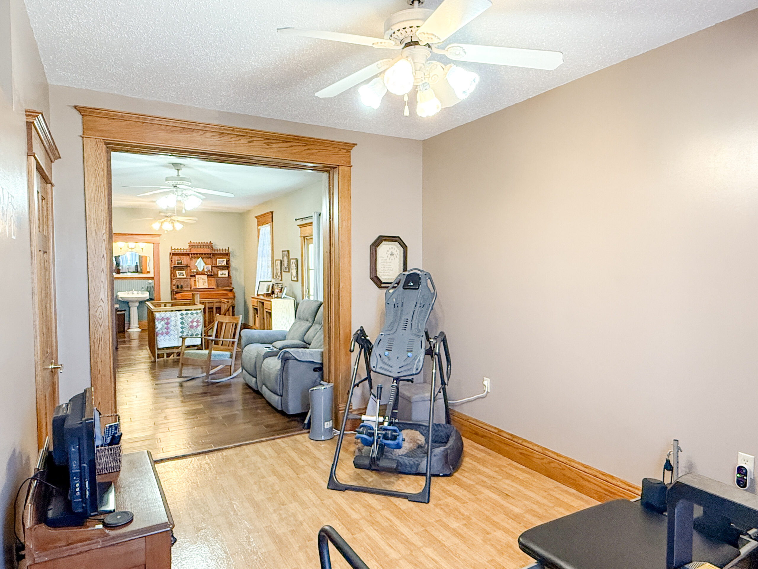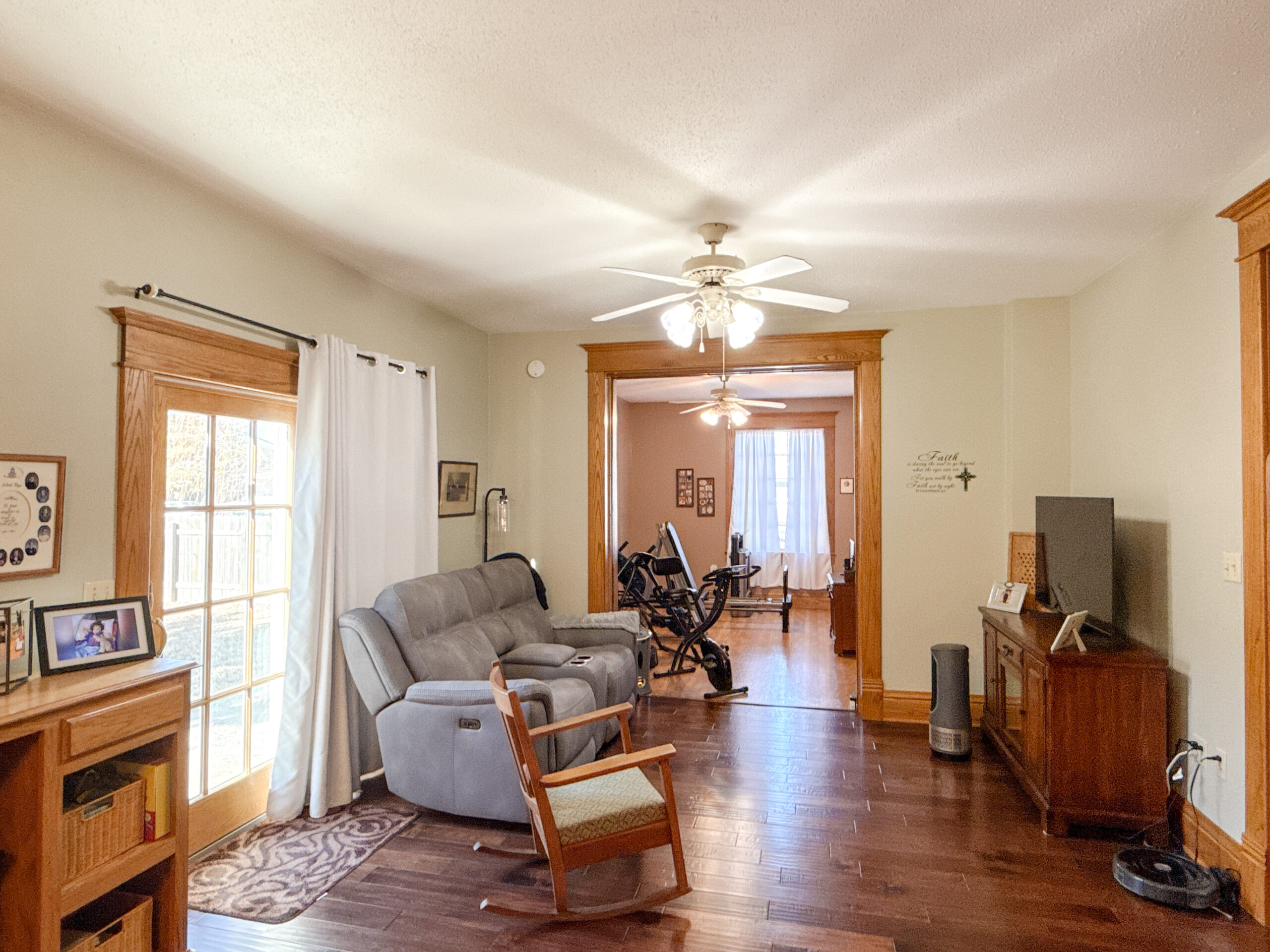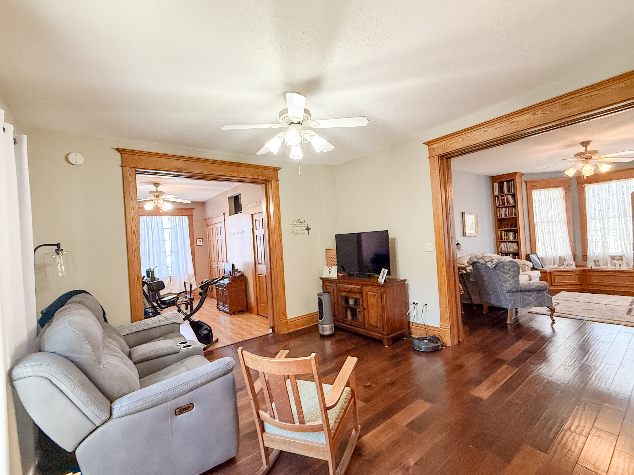 Step inside to be welcomed by tall ceilings, rich wood trim, and a foyer full of character that sets the tone for the rest of the home. The main level features two generous rooms that easily serve as living and dining spaces, a kitchen with all appliances included and a large island, a full bathroom, and a versatile room ideal for a main-floor bedroom, office, or home gym.