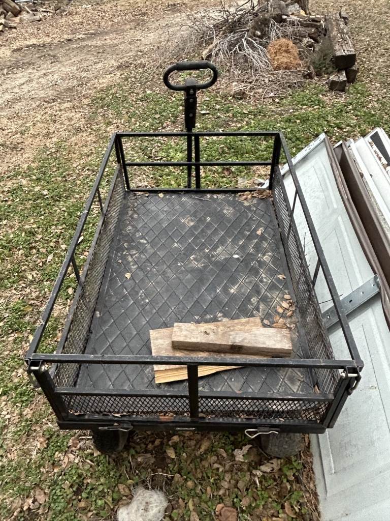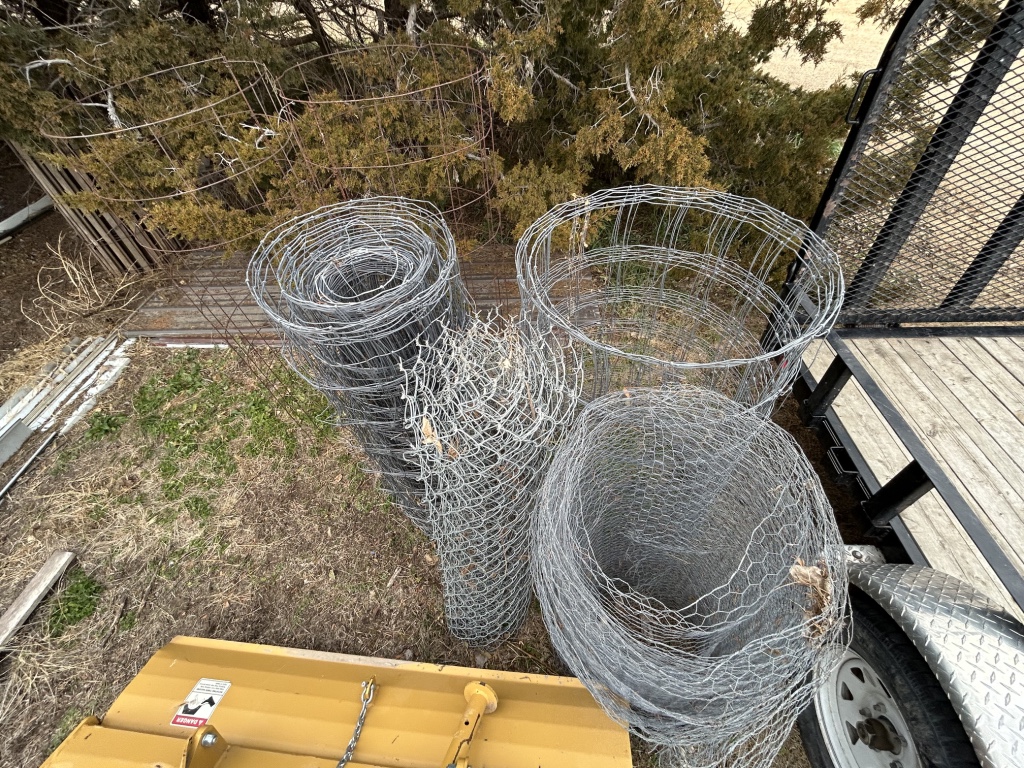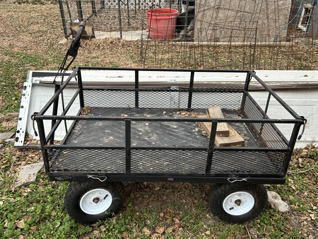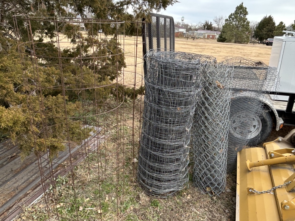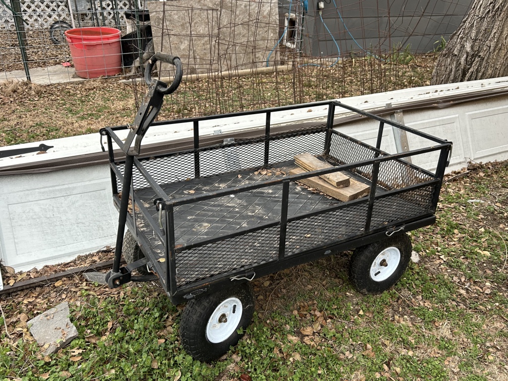 Yard Items: Traeger Grill – Patio Table & Chairs – Metal Double Glider – Misc. Chicken Wire – Horse Shoes w/ Stakes – Tailgate Grill – Tomato Cages – T Posts – Shovels – Rakes – Garden Hoses – Misc. Yard Art – 12 Gallon Blue Band Stoneware Crock – Planters – 4 Wheel Utility Cart