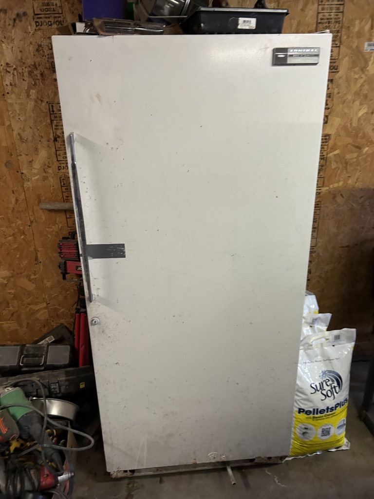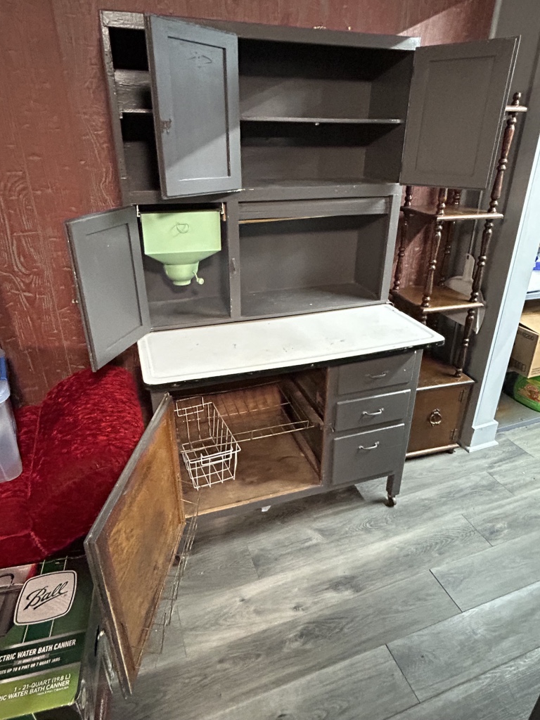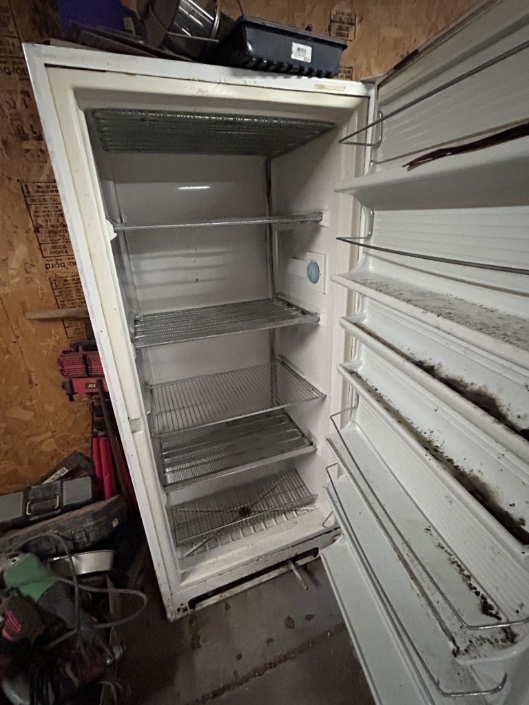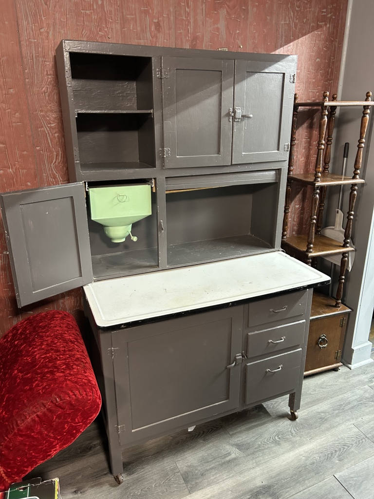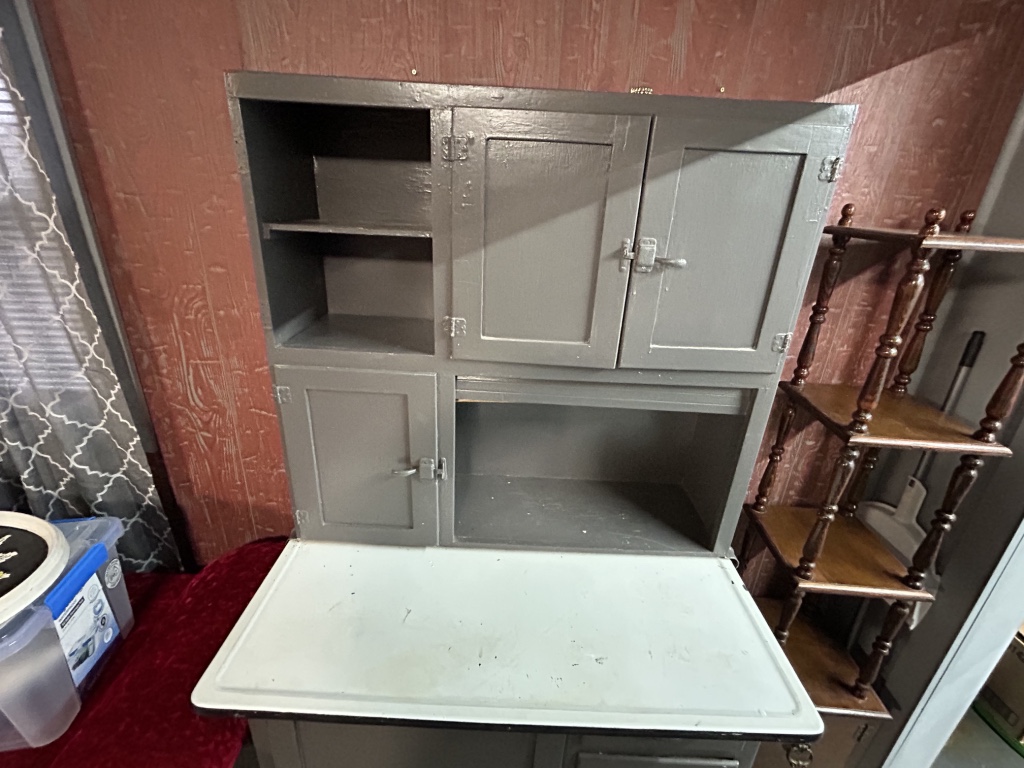 Freezers & Household Items: Kenmore & Admiral Upright Freezers – 2 Husky 52” W x 24” D 2 Drawer Adjustable Height White Workbench Table w/ Solid Wood Top Tables on Rollers – Hammon The Pioneer All Steel Refrigerator Since 1908 (Vintage Ice Box) – Hoiser Cabinet – New Perfection 73 Stove – Vintage Gates – Vintage Metal Sink – Electric Canner