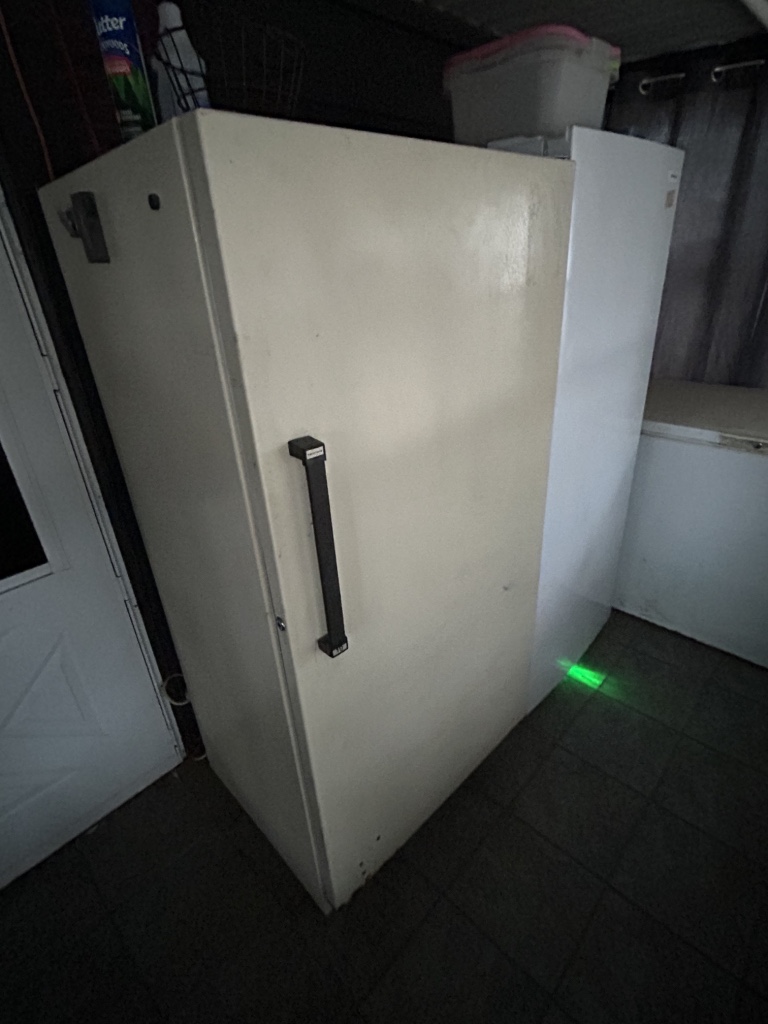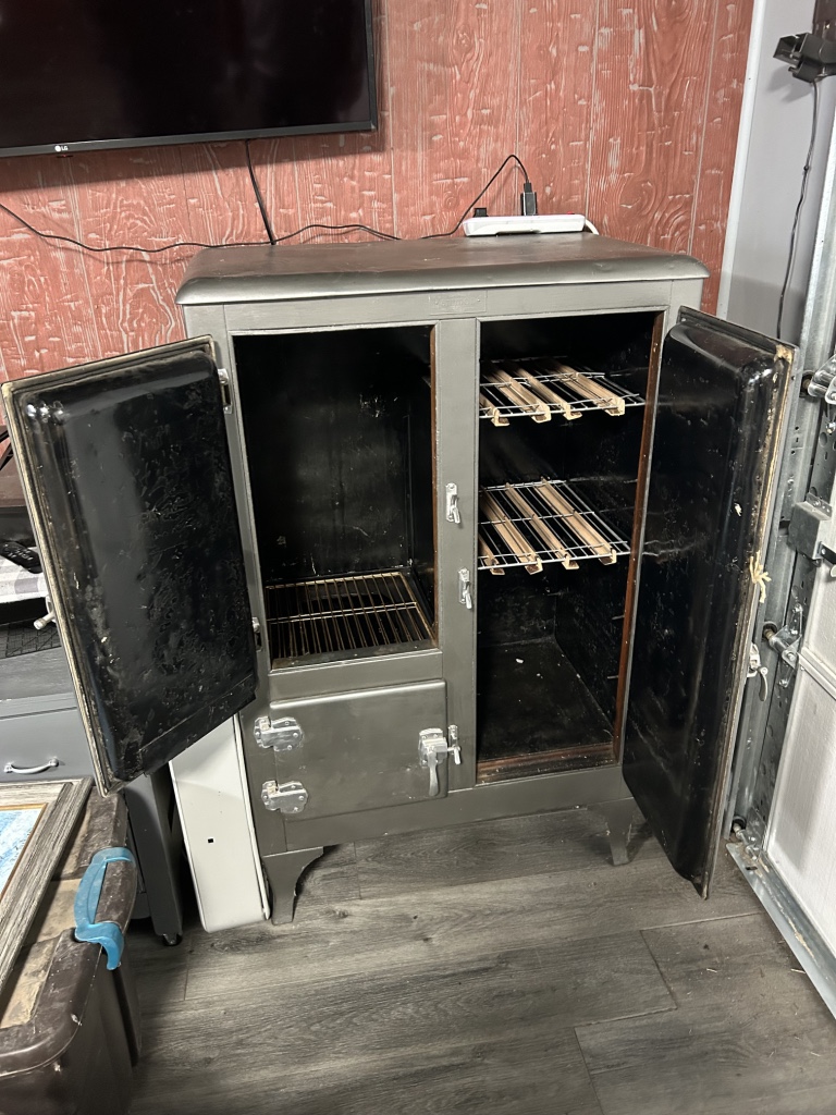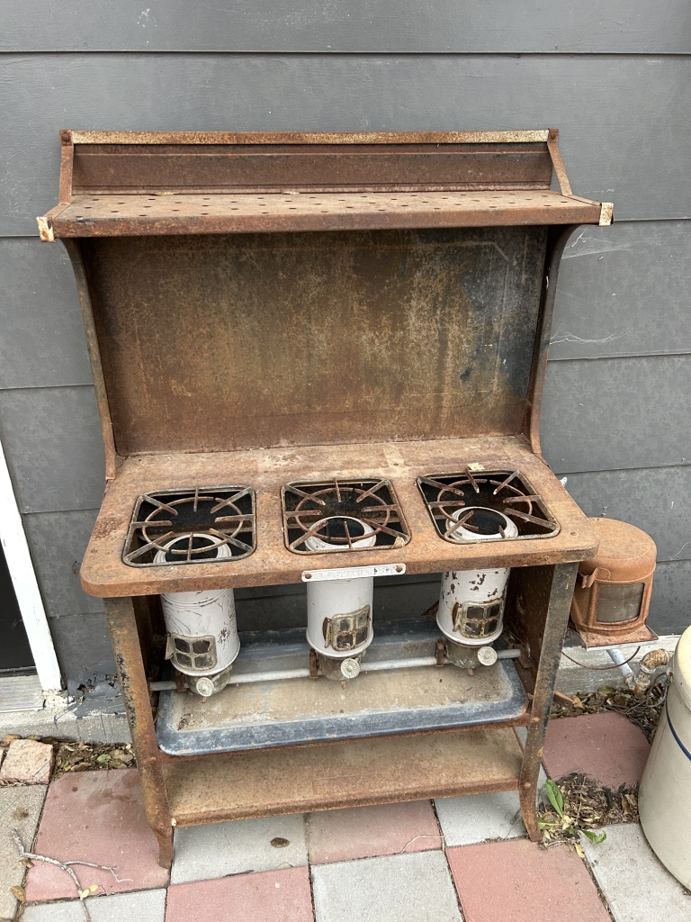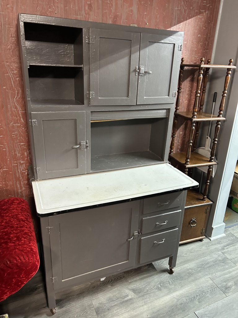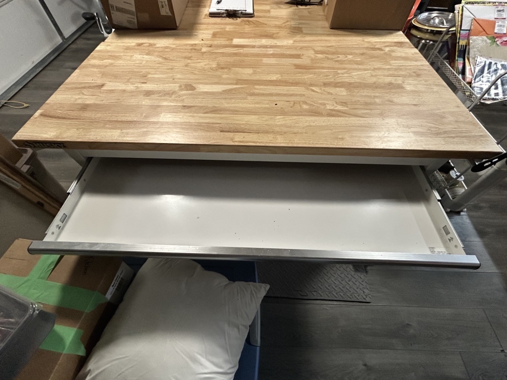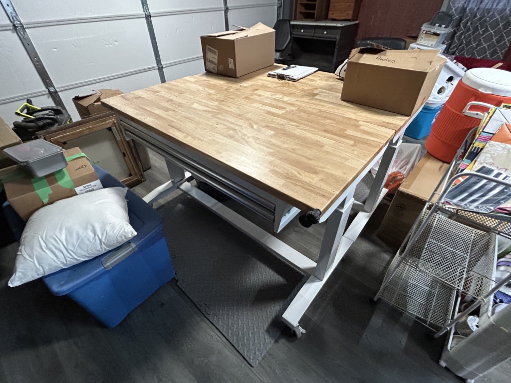 Freezers & Household Items: Kenmore & Admiral Upright Freezers – 2 Husky 52” W x 24” D 2 Drawer Adjustable Height White Workbench Table w/ Solid Wood Top Tables on Rollers – Hammon The Pioneer All Steel Refrigerator Since 1908 (Vintage Ice Box) – Hoiser Cabinet – New Perfection 73 Stove – Vintage Gates – Vintage Metal Sink – Electric Canner